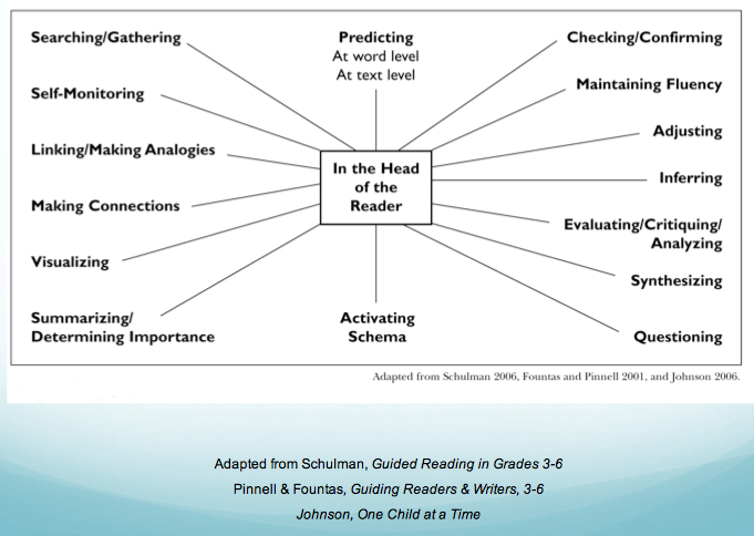 First let me digress.  Last week I finished reading State of Wonder by Ann Patchett, one of my favorite authors.  It’s a wonderfully written story of Marina sent to the Amazon to find out more about the death of her colleague in the pharmaceutical research lab.  While in the jungle she is also meant to check on the progress of Dr. Swenson who doesn’t send reports or updates on her research about the new drug she’s developing. I enjoyed the book and understood every single detail of it.  Did I stop periodically and ask myself a question, or think through a picture in my mind, or literally make any connections as I read?  No, not that I remember.  But, do I think those strategies, as well as others, played a part in my understanding?  Absolutely.  If I had to go back now and answer the question, “Was there a picture in my mind when the young boy Easter was being attacked by a snake?”  Of course there was. And if I brought it to mind for you now, I could describe that scene in great detail. As I read on from chapter to chapter was I wondering/questioning the information about Ander’s death? About the Lakashi tribe and their ability to get pregnant well into their seventies? About why no one taught the deaf boy to communicate better?  I certainly did wonder those things.  Could I make a connection to the Lakashi women constantly braiding Marina’s hair to the days when I sat braiding my two daughters’ long locks?  Sure I could…now.  But while I was reading, I did not make myself metacognitively aware of what I was doing because I didn’t need to.  I was focused on meaning and just kept reading.