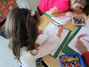 Thanks for reading and commenting. We begin our writer’s workshop with a short drawing lesson (5-10 min. max), then we have a read aloud connected to our writing focus (approx. 10 min.). The children then make books / write independently while I confer or meet with small groups of writers (30 min.) We end with 2-3 students sharing their books. (10 min.) I was amazed that they could sustain for that long, but they really do! The short drawing lesson has helped our bookmaking tremendously, too. The kids enjoy learning a new thing to try in their drawing and they put a lot more time and effort into their pictures. I think this is also because we started our bookmaking with a wordless picture book study and really focused on the illustrations telling the reader what is happening in the book. In addition to our hour-long writer’s workshop, children often choose to work on books during morning and afternoon Explore (free choice/play/stations) time. They really love to write!