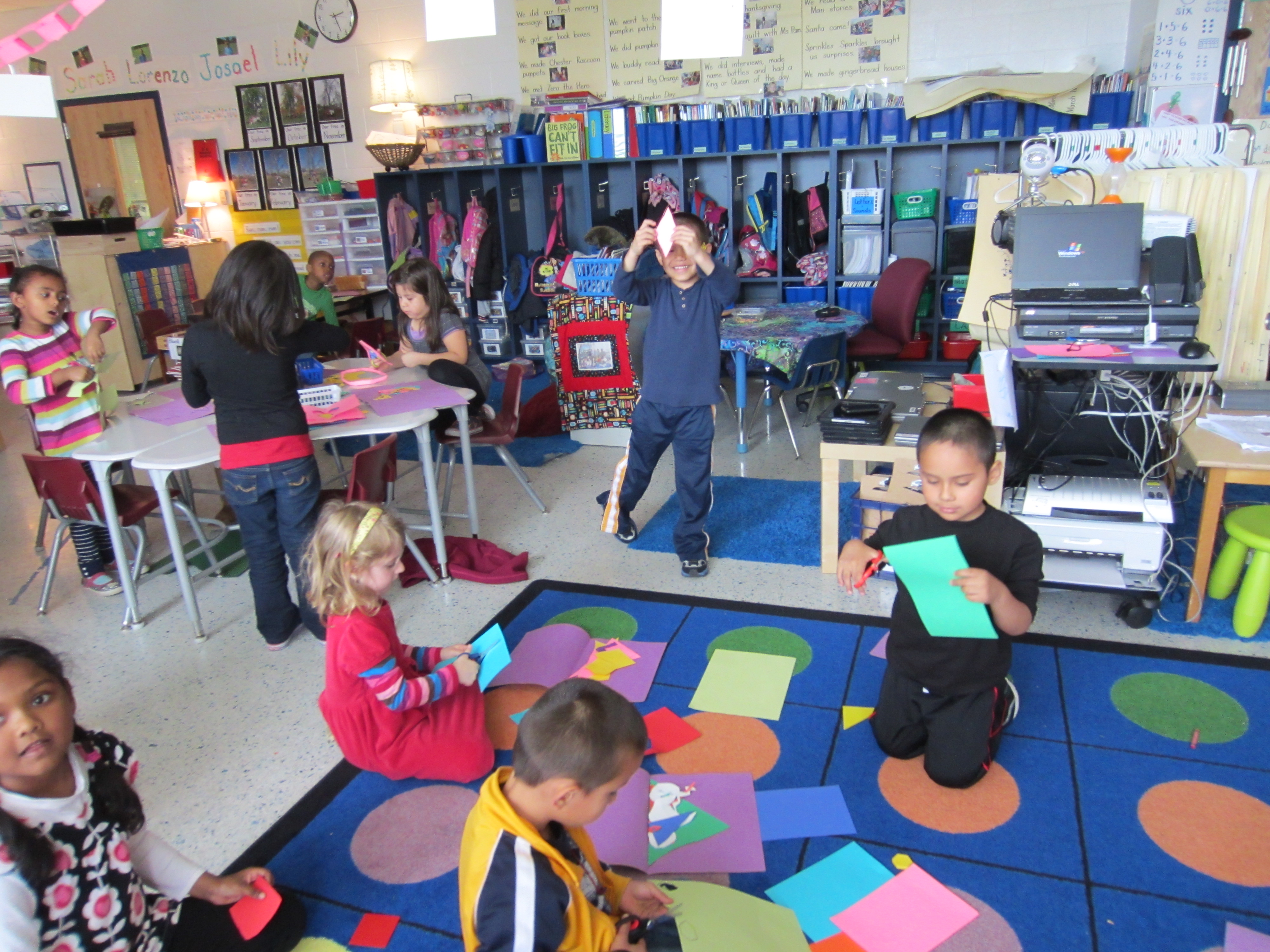We have spent the last two weeks immersed in Wassily Kandinsky’s art. My kindergarteners have been talking about his art, tracing over it on transparency paper, playing with it on our SMARTboard, and creating their own “Kindergarten Kandinsky”. It’s been exciting to listen in on the conversations as the kids compared different pieces and wondered why Kandinsky made the choices he did as an artist. We have had fun playing “I spy” as the students looked closely for “the big blue circle next to the small triangle behind the three parallel lines”. They have enjoyed talking about the pictures Kandinsky made with shapes and we had quite an interesting discussion about how Kandinsky couldn’t have intentionally made an “Angry Bird” in one of his paintings since it was made 100 years ago. It started a great discussion about perspective, imagination and creating stories in our minds. I loved how they connected it to making pictures in our minds as we read!