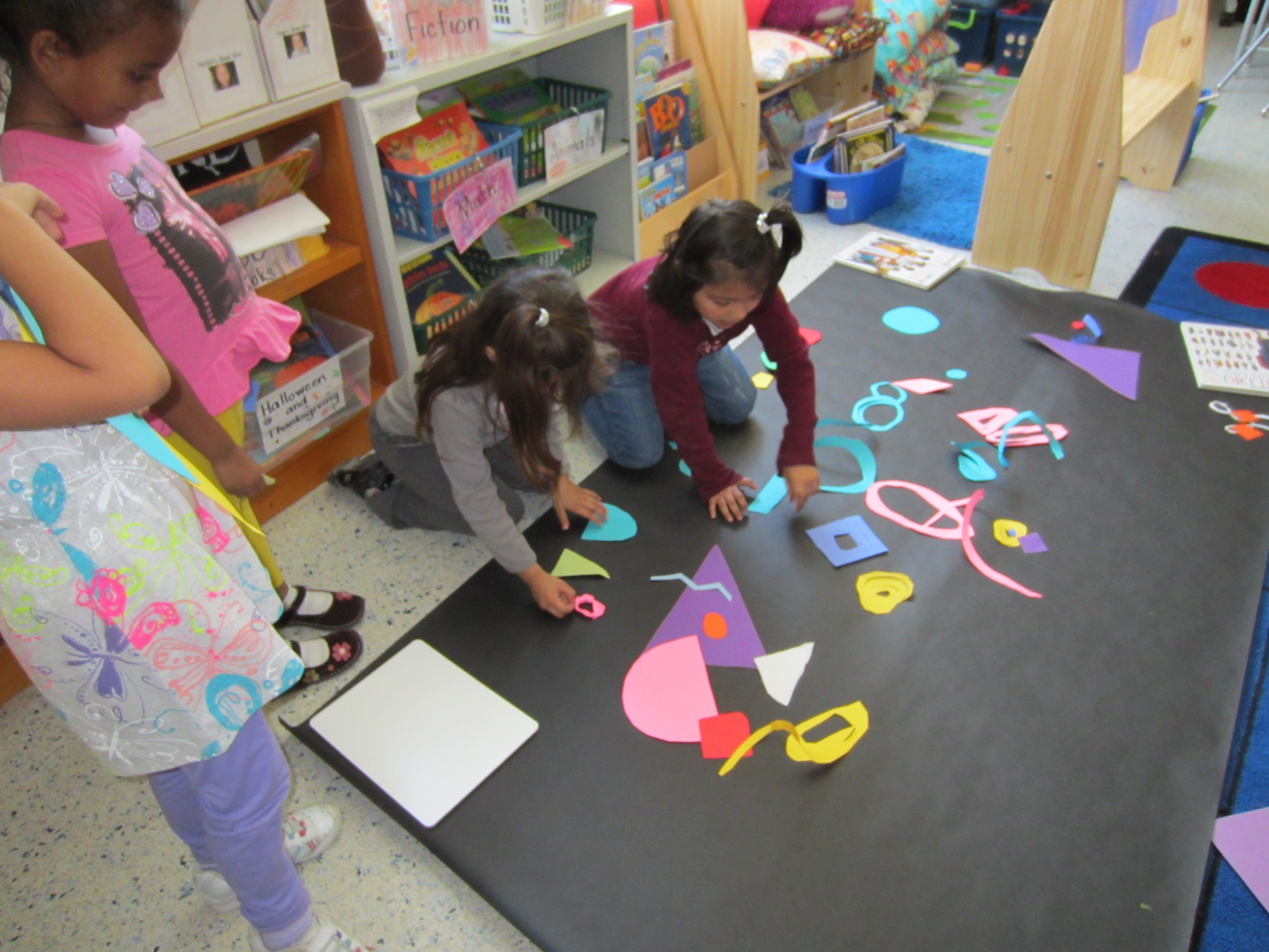 We ended our Kandinsky study by creating a class mural – our “Kindergarten Kandinsky”. The kids cut out a variety of shapes and lines and we carefully placed them on a large piece of butcher paper. We talked about where the shapes would go, how they would overlap, what the proximity to other shapes and lines would be and negotiated our artwork together. After everything was placed as the students wanted it, we glued it down. The kids were so excited to have a giant “Kandinsky” to discuss and talk about, just as we have talked about his original artwork.