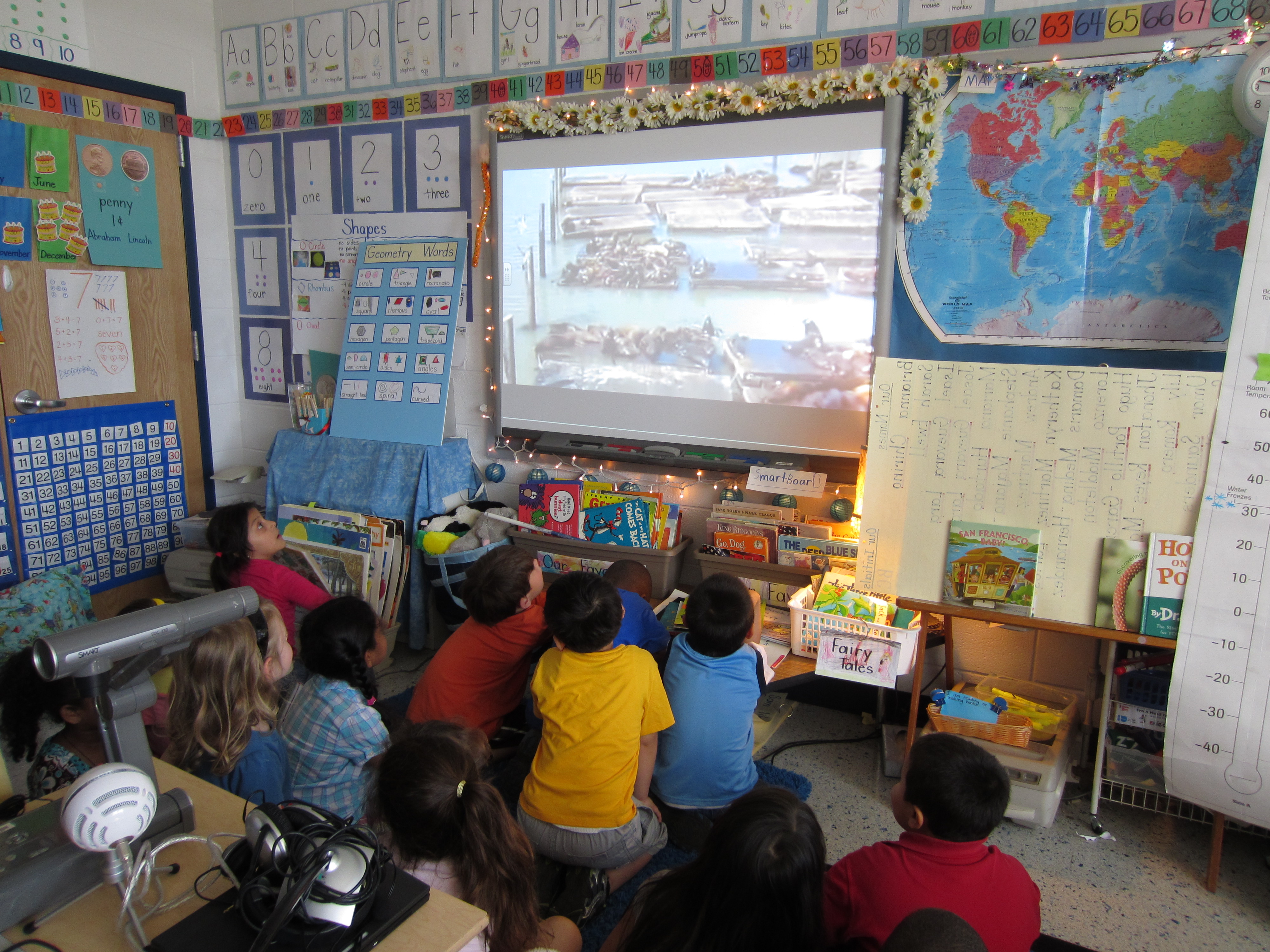 We’ve done several projects focusing on visual art this year with the SMARTboard playing a key role in our unit. We used Kandinsky’s art to learn about geometry and recently we explored the alphabet through photographs. The children looked at alphabet posters on the SMARTboard and found the letters in the photographs. This was a station where kids could look at a variety of photographs and highlight the found letters with a variety of writing tools. We then went out and took our own alphabet pictures and are in the process of editing them into a slideshow and a poster like the ones we have studied. I love how the SMARTboard can allow children to see the art and interact with it. We have looked at a variety of art in math, science, social studies and language arts. With the SMARTboard the children have been able to experience the art as they write on it, trace over it, spotlight it, create their own and interact with it beyond what we can do with an art print. There are many art museums that allow you to download pictures of the art and save them. Google images also has many possibilities for images to use while teaching.