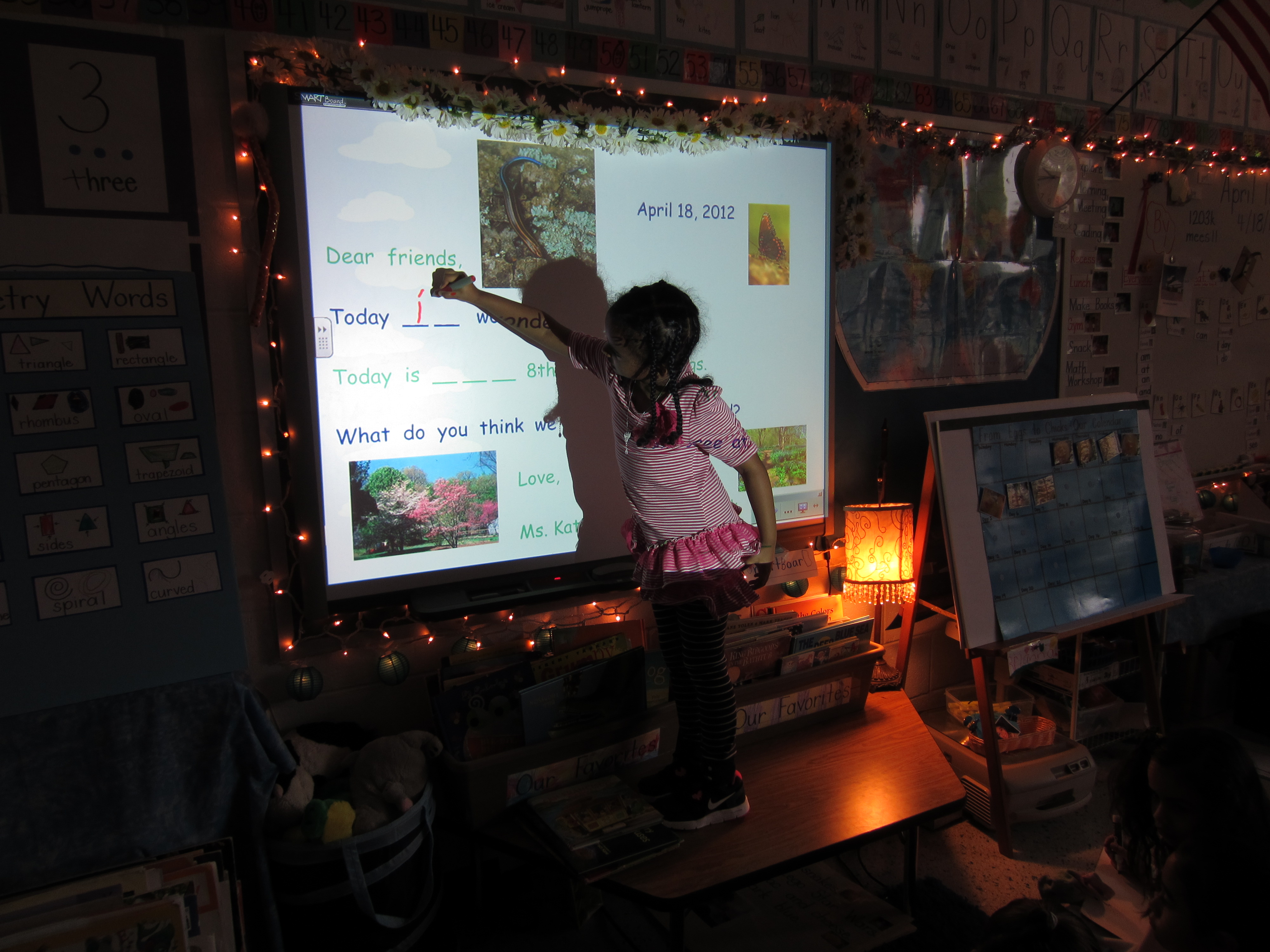 One thing I feel strongly about, however, is that it’s not a replacement for shared writing on chart paper or a community writing book project. It can’t replace shared reading with big books or poems on charts. It’s a great resource to complement my teaching and I make sure my plans for using it have a specific purpose. I don’t use the SMARTboard for everything I do. I still use big books and highlighting tape for shared reading – but I may do a shared reading occasionally on the SMARTboard too if the text I want to use lends itself to being projected and used on the board and will benefit the kids this way. I view the SMARTboard as a tool FOR my students. It’s not just my board – it’s theirs too – that’s why it’s called interactive. I want them to use it independently, interact with it and be proficient with this tool. I see the interactive white board as another tool to engage my students.