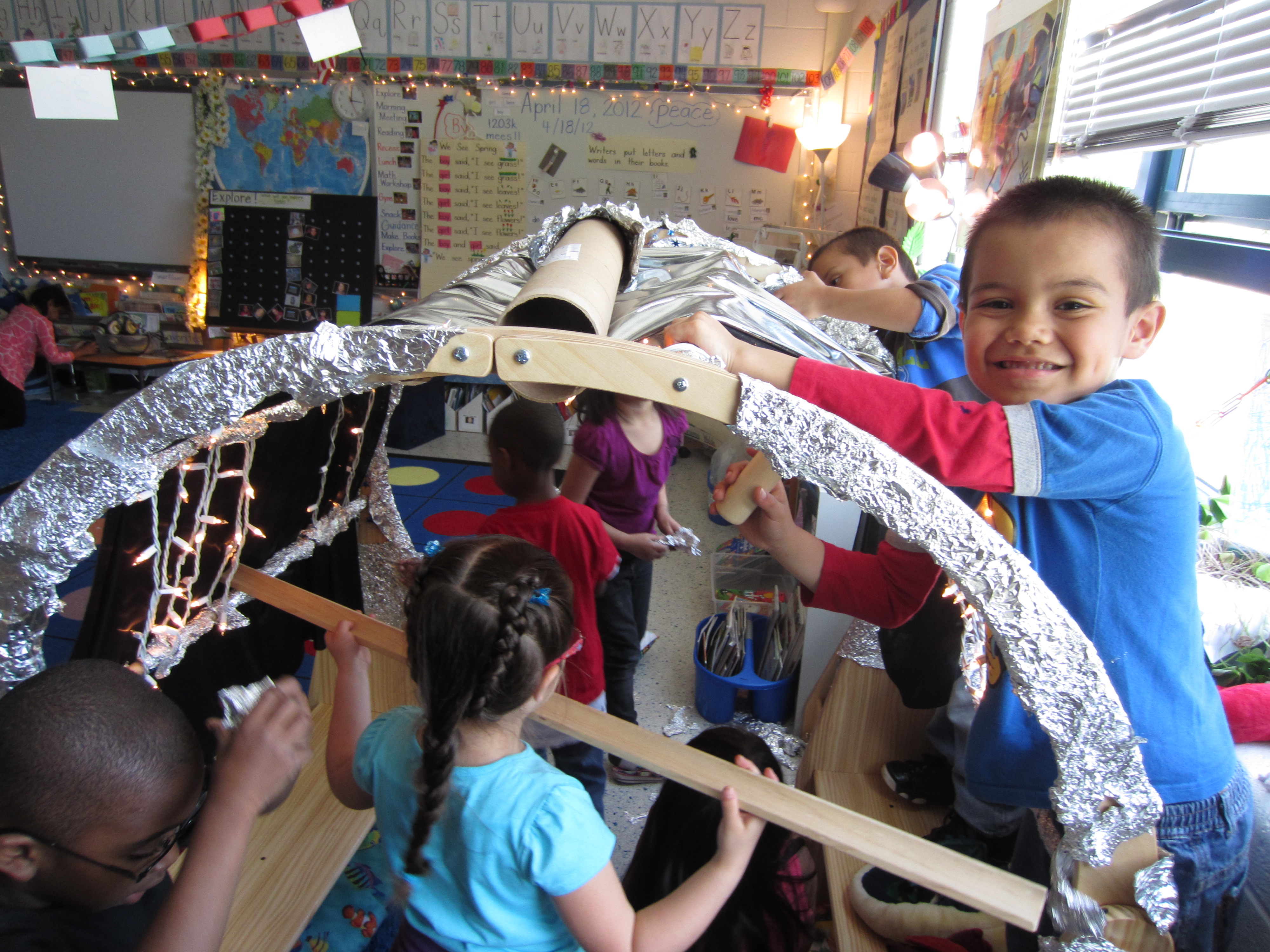 With an interactive whiteboard you can use screenshots from videos, YouTube clips, photographs, etc. and create with writing, drawing and audio right on the image. Recently the space shuttle Discovery flew over our school on its way to the Udvar-Hazy Center near Washington, DC. The kids were so excited to see this and wanted to learn more. I found clips of the space shuttle launch online, as well as a collection of photographs. I put them on the SMARTboard and the kids interacted with them, (while also using a collection of books I got from the library) – labeling parts they knew, circling parts they wanted to learn more about, creating a dialogue with the audio tool to talk about what they saw and what they still wondered about. Then they decided to build their own space shuttle in our classroom (with a LOT of aluminum foil!). This became a dramatic play area for a few weeks.