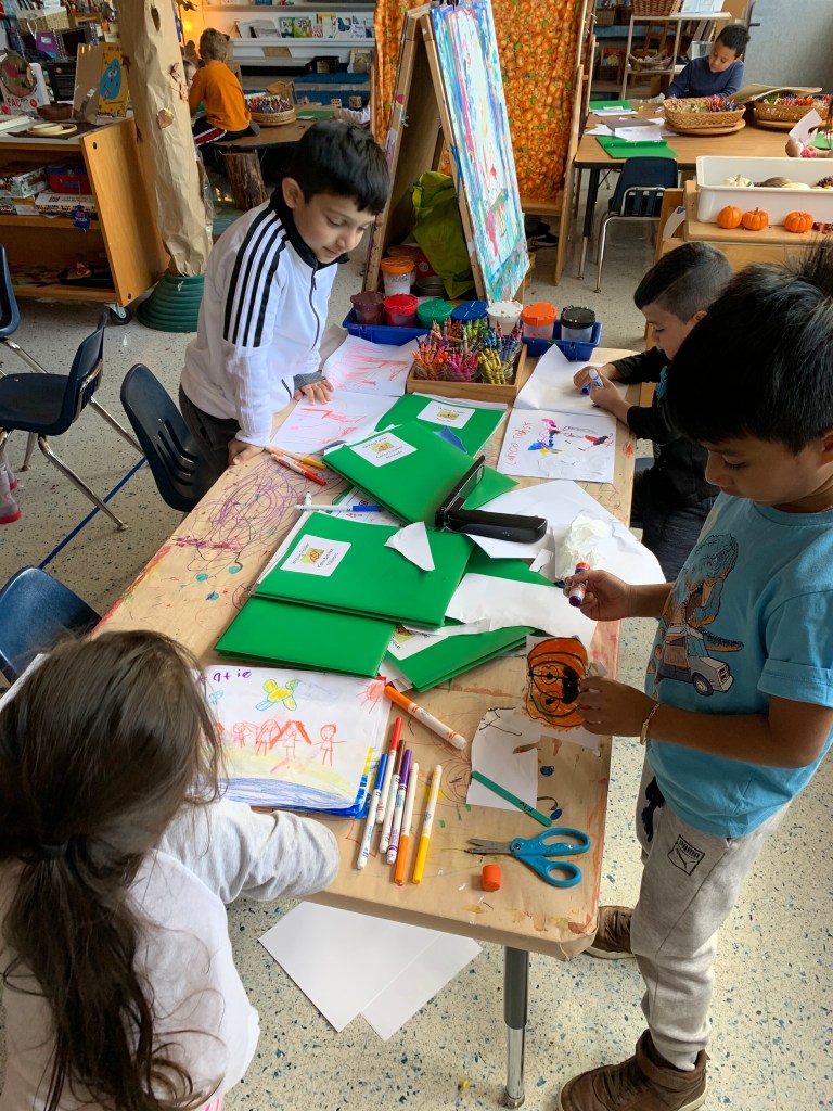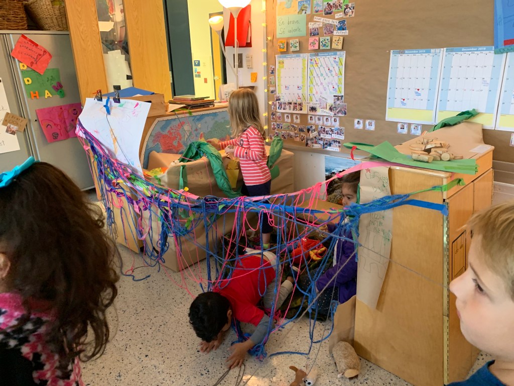 - 2:00-3:00 – Writers’ Playshop (whole group focus lesson on things such as author’s craft, inquiry into a type of genre, finding stories through play, what writers do – then choices of making books, posters, various writing choices and finding stories in open ended play – I play with the kids, confer 1:1 and meet with small groups, ending in whole group share)